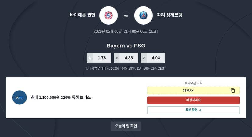유럽 축구의 정점을 다투는 바이에른 대 PSG 베팅 분석이다. 2025-26 챔피언스리그 4강 2차전은 2026년 5월 6일, 알리안츠 아레나에서 열리며 한국 시간으로는 5월 7일 새벽 4시에 킥오프된다. 현재 1XBET 기준 배당은 바이에른 승 1.77 / 무승부 4.82 / PSG 승 4.12으로, 홈팀 바이에른이 근소하게 유리한 구도다.